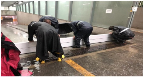秩序人員在地庫(kù)出入口穩(wěn)固防汛沙袋,守護(hù)業(yè)主的生命財(cái)產(chǎn)安全。