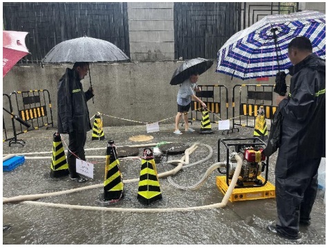 物業(yè)人員冒著大雨緊急用水泵抽水、排水。