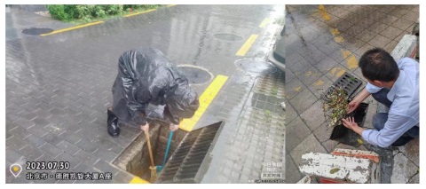 保潔人員正在快速清掃項(xiàng)目排水槽內(nèi)雜物,保障排水槽暢通無(wú)阻。