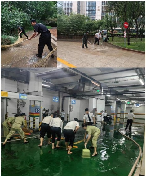 物業(yè)人員正在全力清掃路面和地庫(kù)積水,保障業(yè)主出行安全。