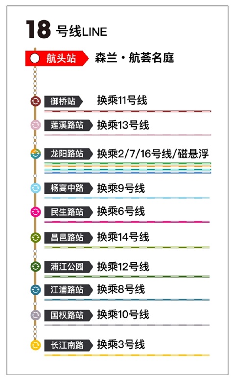18號線被稱為浦東南北新動脈,直通花木-龍陽路副中心、便捷聯(lián)系世紀大道、陸家嘴和楊浦濱江,2站路即可換乘13號線/2號線去張江,無論到市區(qū)還是浦東重要城市節(jié)點都比較方便,名副其實的“換乘王”。