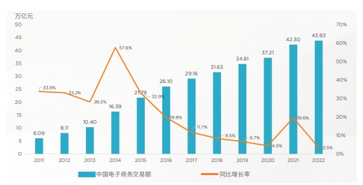 2022年,中國(guó)電子商務(wù)交易額達(dá)到43.83萬(wàn)億元人民幣,同比增長(zhǎng)3.5%,此前一年增長(zhǎng)19.6%。