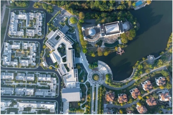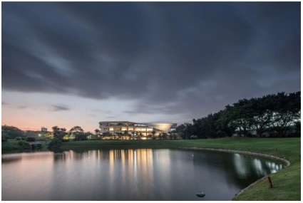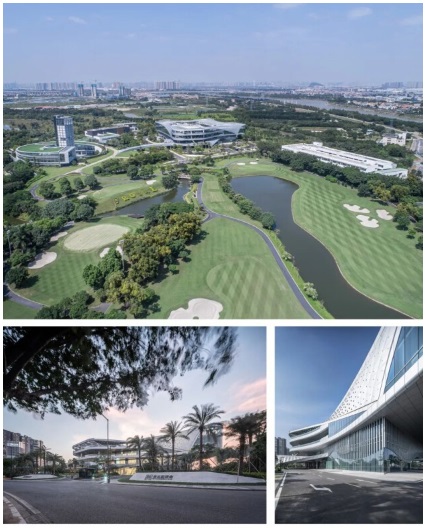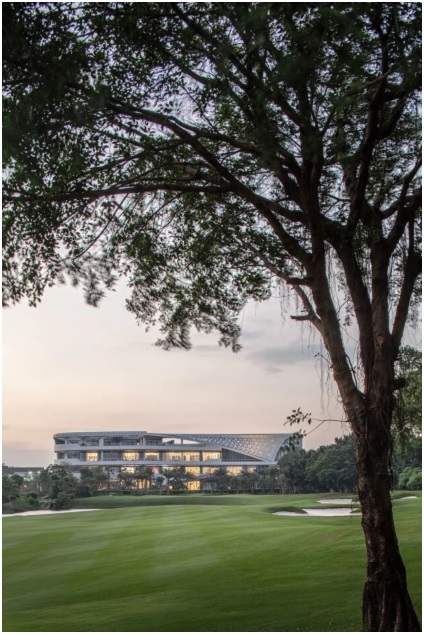 用地一側(cè)為天然水道,自然環(huán)境優(yōu)美,建筑順地勢(shì)而起,與高爾夫球場(chǎng)綠茵完美結(jié)合。建筑用現(xiàn)代化的空間語言,充分利用場(chǎng)地360度景觀資源,通過設(shè)計(jì)回歸自然,建筑外觀舒展、柔和、通透、宜人,層次豐富。