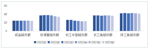 圖 1 五大城市群2022年Q1~2023年Q2物流地產平均租金情況