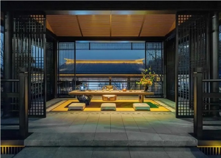 建筑上也同樣遵循營造法式,將歇山頂、懸魚、掛落、美人靠等細(xì)部轉(zhuǎn)譯,呈現(xiàn)中國建筑的東方意境之美 。