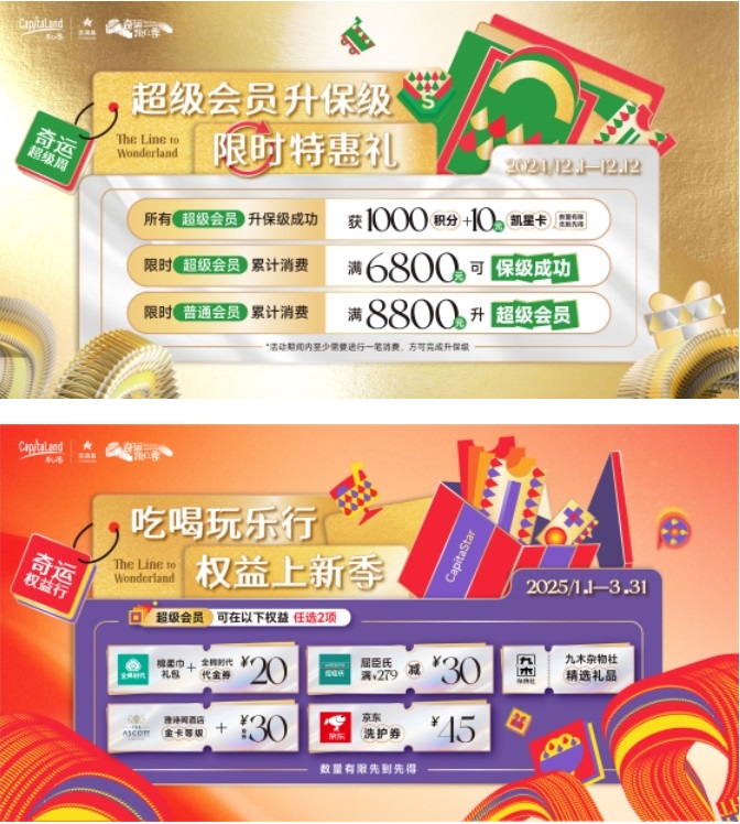 2024年12月1日至12日,所有超級會員升級或保級成功,可獲得1,000積分及10元凱星卡獎勵。另外,助力更多會員享受豐富權益及禮遇,超級會員升保級條件將進行限時調整——超級會員保級從累計消費滿8,000元調整至6,800元,普通會員升級到超級會員從累計消費滿10,000元調整為8,800元。