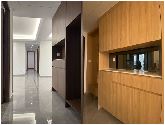 進門,標配的鞋柜內(nèi)嵌穿衣鏡,還預(yù)留了大衣和包包懸掛位。