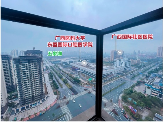 項目的南面,從東往西,南寧二中初中部(青運校區(qū))、天桃實驗學(xué)校小學(xué)部(青運校區(qū))、廣西醫(yī)科大學(xué)東盟國際口腔醫(yī)學(xué)院、廣西國際壯醫(yī)醫(yī)院、五象湖一字排開。