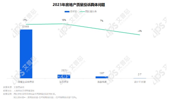 2023年,質(zhì)量投訴中房屋及裝修質(zhì)量相關(guān)投訴33568起,較去年增長17%;車位質(zhì)量相關(guān)投訴2625起,較去年增長18%;違章搭建、設(shè)計不合理相關(guān)投訴分別為1397起、217起。