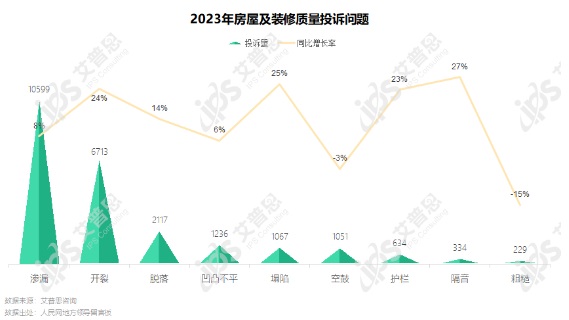 本年度房屋及裝修質(zhì)量投訴中主要問題為滲漏、開裂,相關(guān)投訴量分別為10599起、6713起,分別較去年增長8%、24%,塌陷、隔音相關(guān)投訴分別同比增長25%、27%。