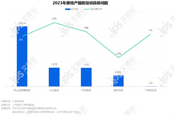 服務(wù)類投訴中,物業(yè)及配套服務(wù)投訴量36614起,較去年增長8%,其中亂用維修基金、亂收電費、物業(yè)不作為等問題投訴較多;辦證服務(wù)投訴量11526起,較去年大幅增長26%,主要投訴問題為無法辦理房產(chǎn)證;交房服務(wù)投訴11432起,較去年增長14%,主要涉及延期交房;服務(wù)態(tài)度相關(guān)投訴6889起,較去年下降21%,工作人員辦事推脫、拖延相關(guān)投訴較多。