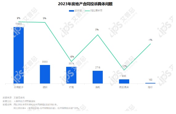 2023年,合同類投訴中合同欺詐投訴量11983起,較去年增長9%,主要涉及面積縮水、虛假宣傳等問題;退款投訴3933起,較去年增長9%;爛尾投訴3574起,較去年下降8%。此外,強買強賣、降價相關(guān)投訴較去年均下降。