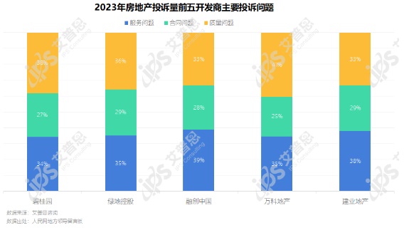 從投訴分類來看,2023年融創(chuàng)中國、建業(yè)地產(chǎn)服務(wù)問題相關(guān)投訴居多,占比分別為39%、38%;碧桂園、萬科地產(chǎn)質(zhì)量問題相關(guān)投訴較多,分別占比38%、41%。