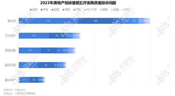 2023年,投訴量前五開發(fā)商質(zhì)量投訴具體問題中,滲漏、開裂為主要問題,碧桂園收到滲漏相關(guān)投訴314起、開裂相關(guān)投訴186起,萬科地產(chǎn)收到的滲漏、開裂相關(guān)投訴分別為162起、83起;綠地控股收到的滲漏、開裂相關(guān)投訴分別為119起、81起。