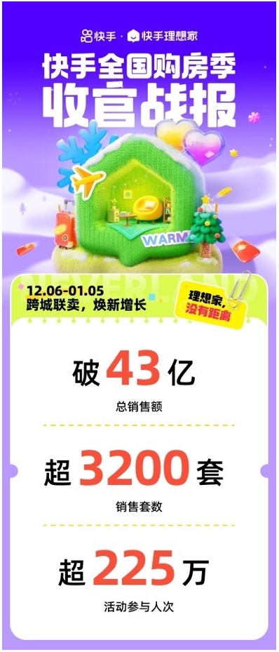 而此次全國購房季跨年跨城大促活動(dòng),快手理想家基于跨城聯(lián)賣模式,讓更多主播、機(jī)構(gòu)、開發(fā)商實(shí)現(xiàn)全國獲客,完成高效撮合成交,也滿足了平臺用戶更精準(zhǔn)和差異化的購房需求,讓購房者更簡單方便實(shí)現(xiàn)異地購房,讓理想家沒有距離。