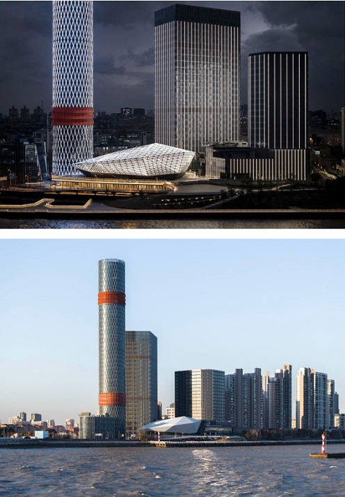 “定海神針”——長灘“風塔”是一個直徑26.5米、高度180米的圓筒狀高聳結構,建筑外形如東海龍宮的“定海神針”,矗立于長江口,俯視著上海的母親河黃浦江。整個塔身地下三層、地上十八層,是目前寶山區(qū)最高的建筑物!岸êI襻槨睂崬槭姓淼赖呐棚L井,建筑師在保持原有排風功能的前提下,化腐朽為神奇,賦予了其新的生命,不僅增加了商業(yè)功能,滿足廣大市民觀光休閑的需求,更成為整個項目,乃至寶山和上海東海之濱的新的標志性建筑。
