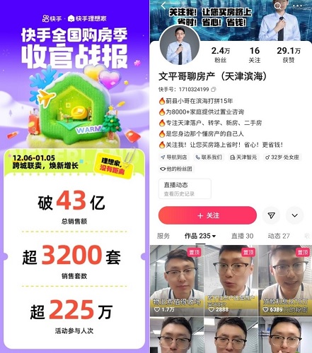 在前不久結(jié)束的快手理想家全國購房季跨年跨城大促活動中,文平哥成交了42套房源,GTV達(dá)到8229萬元,實現(xiàn)了爆發(fā)式簽單。