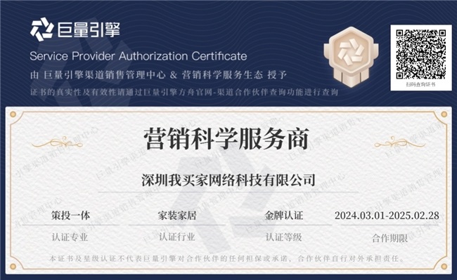 近日,巨量引擎營銷科學(xué)2024年H1「投策一體」賽道金牌認(rèn)證服務(wù)商評選名單公布,經(jīng)過多輪的篩選和答辯,優(yōu)居脫穎而出,獲得當(dāng)前家裝家居行業(yè)唯一一家「營銷科學(xué)金牌認(rèn)證服務(wù)商」。