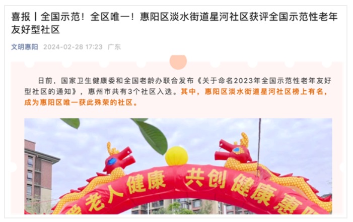 喜訊!國(guó)家衛(wèi)生健康委和全國(guó)老齡辦聯(lián)合發(fā)布《關(guān)于命名2023年全國(guó)示范性老年友好型社區(qū)的通知》,惠陽(yáng)星河丹堤榜上有名,獲評(píng)全國(guó)示范老年友好型社區(qū) ,成為惠陽(yáng)區(qū)唯一獲此殊榮的社區(qū),因此被地方媒體紛紛報(bào)道點(diǎn)贊。