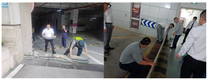 為了抵御暴雨,物業(yè)人員爭分奪秒地放置沙袋,安裝防汛擋板,以最快的速度攔截積水。