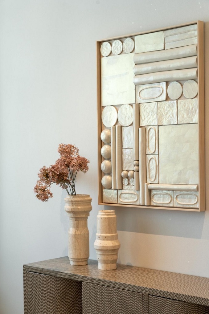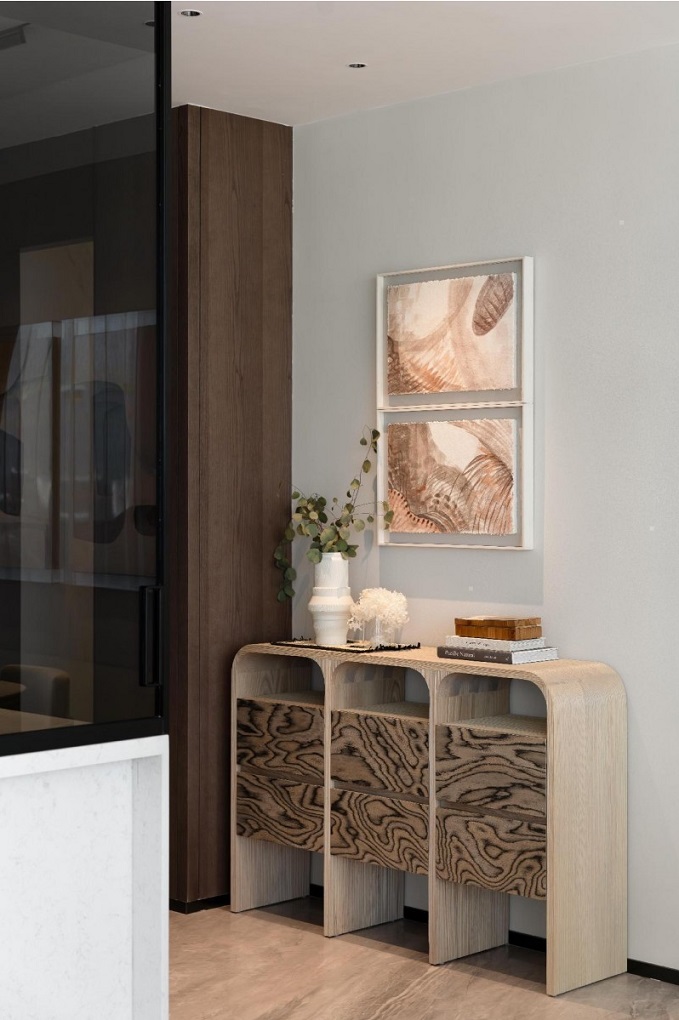 全屋結(jié)合奢石藝術(shù)和木質(zhì)溫暖,將自然材質(zhì)幻化為生活的敘事詩。電視背景墻以大理石巖板——“碧玉玲瓏”呈現(xiàn),宛如戲劇的幕布,觀影功能與生活美學(xué)兼具。在這里,藝術(shù)是空氣,是水,亦是生命——隨處可見的藝術(shù)掛畫呼應(yīng)現(xiàn)代極簡格調(diào),日常中鏈接精神的愉悅。