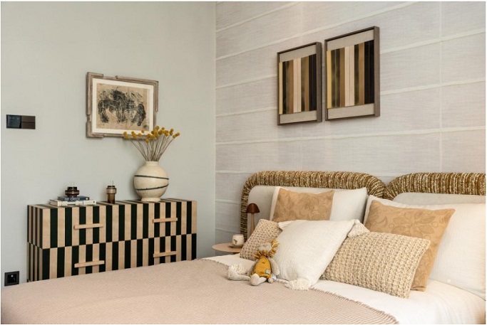 沉穩(wěn)的暖色基調(diào)賦予次臥雋永的情緒表達(dá)。日光自然流瀉,提升整個空間的明亮溫暖。藝術(shù)畫作、棉麻抱枕、小巧擺件……這些具有情感記憶的物件在方寸之間,讓人心生暖意。輕盈心境和精神留白在此間停泊,安放溫馨的生活向往。