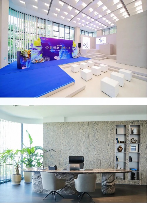 項目領導陪同來訪嘉賓一同參觀了樣板間。踏入樣板間,仿佛穿越到未來的商務辦公場景之中。約7.2米挑高首層大廳,以企業(yè)名片般的首道空間呈現(xiàn),讓來訪者直觀感受到企業(yè)的實力;辦公區(qū)內(nèi)靈活多變的交流空間、綠色生態(tài)的辦公空間,以人文色彩賦予商務空間不一般的體驗;緊隨時代潮流打造的直播間、實驗室,開拓了企業(yè)展示自我的新平臺;獨立總裁層,規(guī)劃辦公室、會議室、茶室等功能空間,隨時開啟商務會晤……從空間布局到創(chuàng)新設計,每一處設計都蘊含著匠心巧思,無一不透露著對未來商務空間的創(chuàng)新引領。這也引得參觀者紛紛駐足,無不贊嘆設計師的巧妙構思與項目的非凡品質(zhì)。