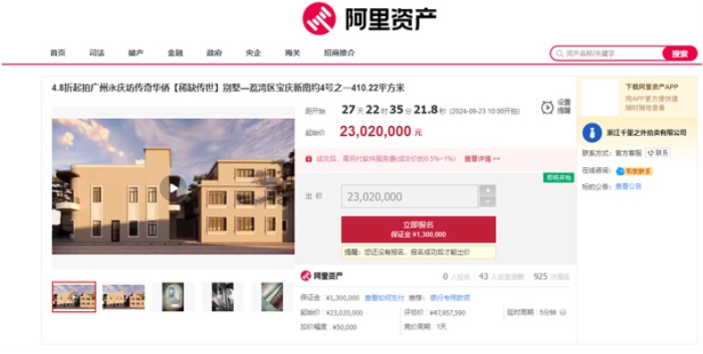 浙江千里之外拍賣有限公司將于2024年9月23日10時(shí)起至2024年9月24日10時(shí)止(按交易規(guī)則延時(shí)的除外)在阿里資產(chǎn)平臺(tái)上對(duì)廣州永慶坊傳奇華僑【稀缺傳世】別墅—荔灣區(qū)寶慶新南約4號(hào)之一進(jìn)行公開競(jìng)價(jià)活動(dòng)。