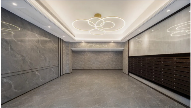 入戶門廳采用黃金鉆石材+鋁板的主體,搭配金屬格柵吊頂?shù)慕ㄖL(fēng)格,將現(xiàn)代生活方式和美學(xué)理念融入歸家設(shè)計(jì)之中,尊崇歸家的第一禮序于此蔓延,情彰顯生活中的儀式感、自在感。