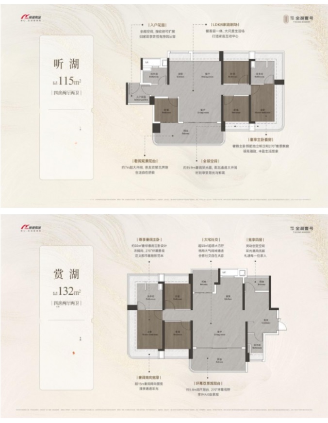 建筑面積約115㎡聽湖四房,將空間尺度推向新高度。約15.9米南向五開間采光,搭配超大方廳設(shè)計(jì),實(shí)現(xiàn)了越級(jí)的豪宅空間體驗(yàn);全明通透的布局與奢闊觀景陽臺(tái),讓每一處空間都能享受到充足的陽光與鮮氧。