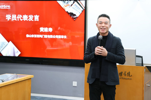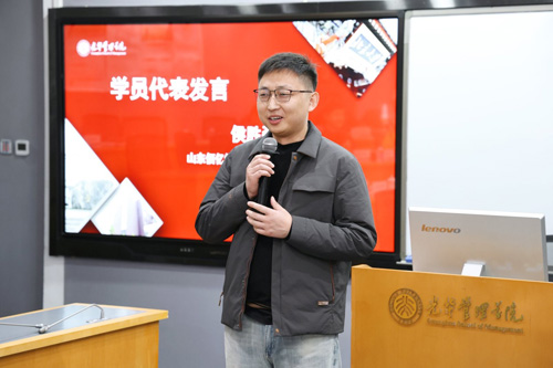 11月18日上午,首先舉行了開班式。北京大學(xué)光華管理學(xué)院副院長張圣平教授致辭歡迎同學(xué)們的到來。接著,全聯(lián)房地產(chǎn)商會節(jié)能門窗分會副會長、中國建筑節(jié)能協(xié)會系統(tǒng)門窗分會副主任委員、山東佰億緣門窗有限公司董事長侯勝磊,全聯(lián)房地產(chǎn)商會節(jié)能門窗分會副會長、佛山市門窗行業(yè)協(xié)會聯(lián)席會長、佛山市百利瑪門窗有限公司董事長黃維壽,全聯(lián)房地產(chǎn)商會節(jié)能門窗分會副會長、中國建筑節(jié)能協(xié)會系統(tǒng)門窗分會副主任委員、陜西省建筑節(jié)能協(xié)會高性能門窗幕墻專委會會長、素派建筑科技(陜西)有限公司董事長張杰代表新同學(xué)發(fā)言。