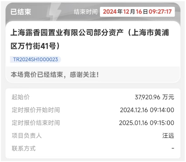 2024年12月16日,上海黃浦區(qū)萬竹街41號露香園小區(qū)一棟文物保護建筑在上海聯(lián)合產(chǎn)權(quán)交易所上拍,經(jīng)歷僅一輪報價后,該項資產(chǎn)成功拍出,競拍價即為起始價3.79億元。知情人士告訴鳳凰網(wǎng)房產(chǎn),此筆交易是定向拍賣(即先確定意向買家,再走競拍流程),競得人為浙江某企業(yè)主。