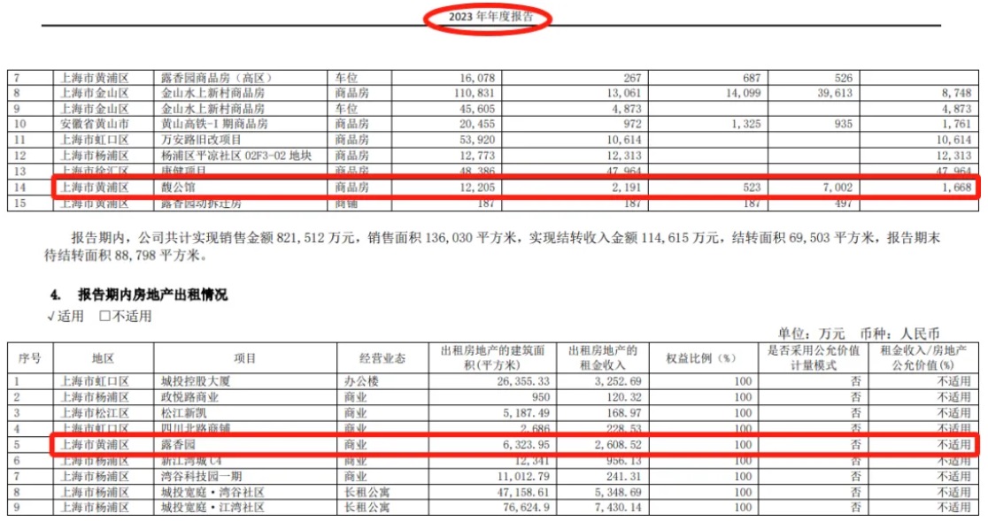 (城投控股2023年年報,新增在售商品房馥公館,露香園出租商業(yè)面積剩余6233.95㎡)