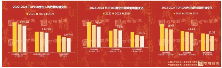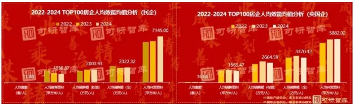 TOP100房企大部分效能數(shù)據(jù)均值下降,2024年TOP100房企人均全口徑銷售額均值3200萬,人均權(quán)益銷售額2300萬,元均權(quán)益銷售額58.9元,民營企業(yè)部分?jǐn)?shù)據(jù)出現(xiàn)探底狀態(tài)。