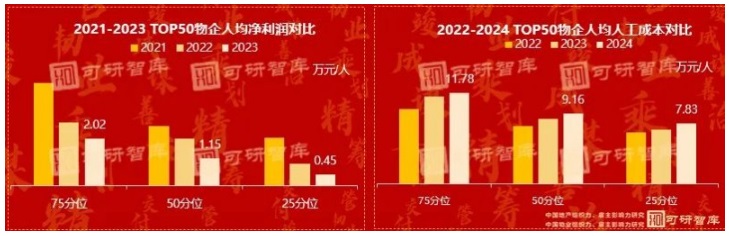 2023年,TOP50 物企的人均凈利潤進(jìn)一步下滑,降幅波動(dòng)受到諸多因素的交互影響,包括服務(wù)定價(jià)、設(shè)備維護(hù)周期、員工規(guī)模增長、社保調(diào)基、自持與委外人員比例等。近兩年來,TOP50 物企廣泛采用分級(jí)分類的管控模式以及項(xiàng)目配置策略,同步積極探索片區(qū)統(tǒng)籌管理模式,聯(lián)合品控部門強(qiáng)化供應(yīng)商管理能力等多種調(diào)節(jié)手段,力求改善現(xiàn)狀。