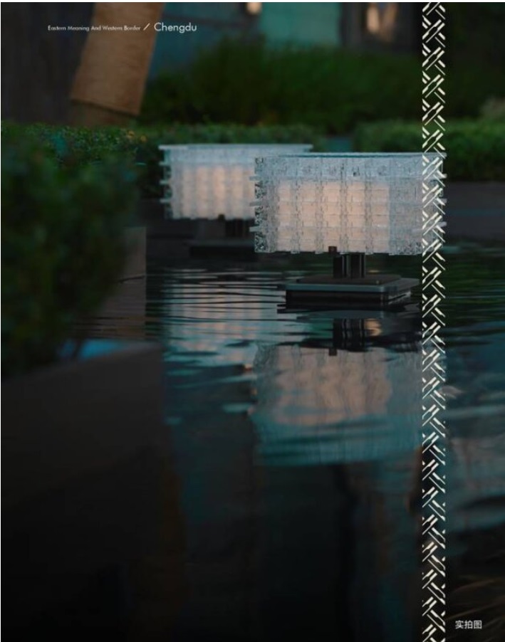 除此之外,團隊更巧妙地將竹編紋樣融入水景燈飾,演繹巴蜀在地文化;單株造型獨特的羽毛楓與孤品級特制天青汝窯瓷片景墻相映成趣,瓷片釉色溫潤如“雨過天青云破處”,靜訴千年文化的當代賦新。