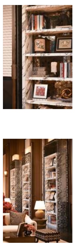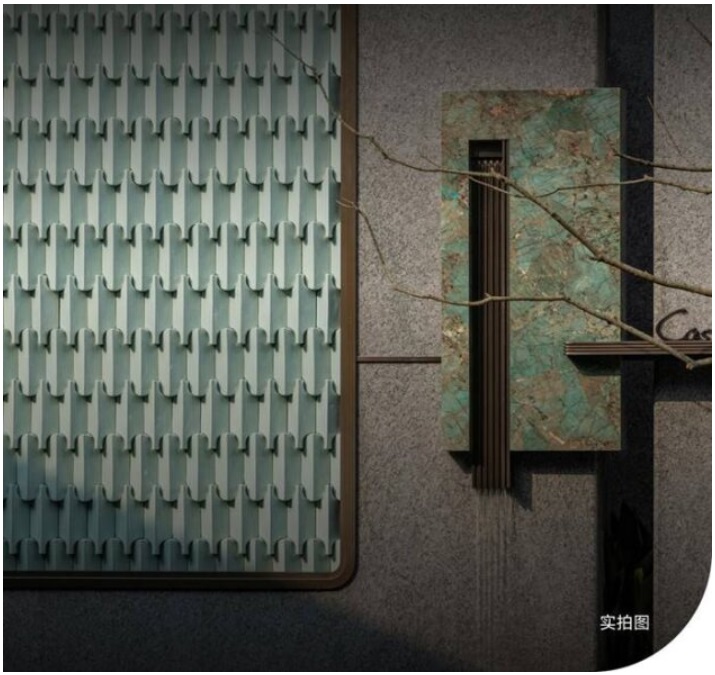 景墻一側(cè)的黃金比例處,“石中愛馬仕”亞馬遜綠奢石與汝窯瓷片景墻珠聯(lián)璧合,相得益彰。流水、瓷光、奢石、楓影于「藏錦」,共織一席。