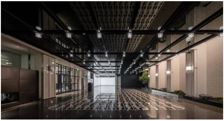 「藏錦」以藝術(shù)匠心打造地庫歸家空間,步步成景。地下歸家大堂外延,仿古鏡吊頂?shù)褂尘穹枺~條與環(huán)氧磨石無縫拼接,搭配陣列式立柱,共筑儀式感歸家之路。