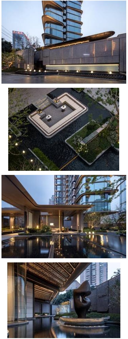 入口處,海藍寶花崗石整雕而成的波浪板圍墻,每一塊需耗時一周以上精雕細琢;金屬鐵藝以類榫卯工藝拼接,焊點隱匿無痕。步入內(nèi)庭,水景潺湲。水落之處的弧度與聲響,都經(jīng)「藏錦」設計團隊反復調(diào)試,最終成型。
