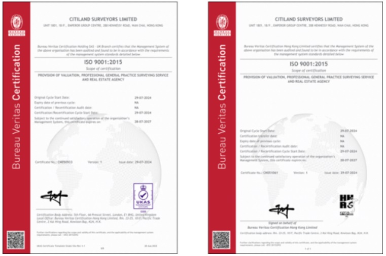「天俊測量師行」以提供優(yōu)質(zhì)服務(wù)為目標(biāo),致力于培養(yǎng)團隊嚴(yán)謹(jǐn)?shù)墓ぷ鲬B(tài)度與專業(yè)水平,制定高標(biāo)準(zhǔn)的運營程序與規(guī)范,力求超越客戶的要求和期望,成為客戶首選的專業(yè)測量師行。公司的估值、產(chǎn)業(yè)測量及物業(yè)代理服務(wù)已成功通過ISO 9001:2015國際質(zhì)量認(rèn)證,獲得香港認(rèn)可處(HKAS)和英國認(rèn)可局(UKAS)等頒發(fā)的國際認(rèn)證,標(biāo)志著「天俊測量師行」持續(xù)提供高質(zhì)量服務(wù)與管理系統(tǒng),深受各界認(rèn)可。