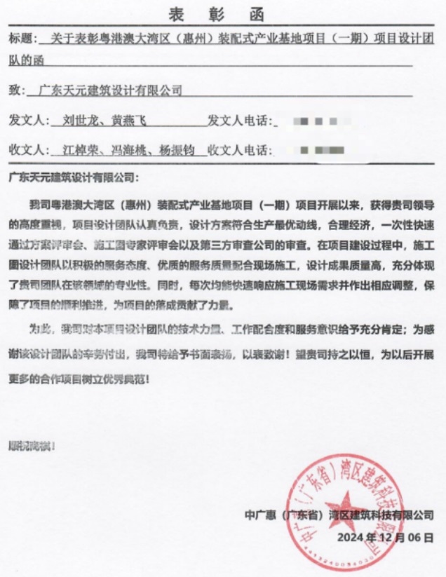 我司領(lǐng)導(dǎo)高度重視本項目建設(shè)實施,確保設(shè)計方案不僅嚴(yán)格遵循生產(chǎn)動線最優(yōu)化原則與經(jīng)濟(jì)合理性要求,而且在方案評審會、施工圖專家評審會以及第三方審查公司的嚴(yán)格審查中,均一次性順利通過,彰顯了設(shè)計方案的卓越品質(zhì)與高度專業(yè)性。鑒于出色表現(xiàn),中廣惠(廣東。硡^(qū)建筑科技有限公司特給予我司書面表揚,以表彰團(tuán)隊在項目中所做出的杰出貢獻(xiàn)。