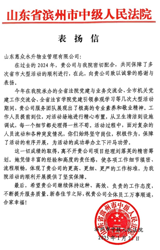 僅2024年,永升項(xiàng)目團(tuán)隊(duì)共計(jì)協(xié)助舉辦山東省法院黨建與業(yè)務(wù)交流會(huì)等8場(chǎng)省級(jí)重大活動(dòng),服務(wù)滿意度達(dá)100%,獲濱州市中級(jí)人民法院專函表彰。