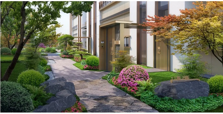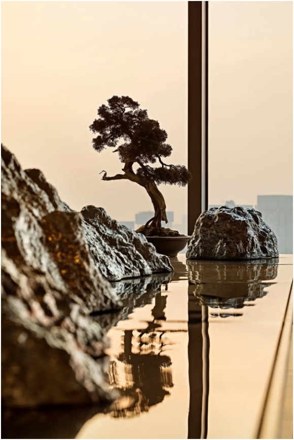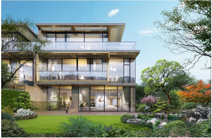 不再復刻固定的風格,而是追尋東方意境與當代建筑的靈感碰撞表達。立面深度探索線、面、體的現代三維美學,運用大面積玻璃、高級鋁板、高檔石材等,構建輕奢詩性場域。園林營造則暗藏「九相」中式哲學,瀑落成弦、泉涌為韻、松影寫意、亭閣點題等,每一步都踏響山水畫境的平仄。
