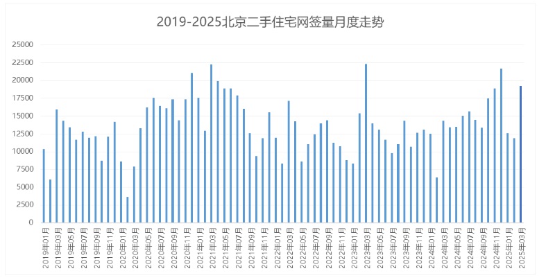 北京市住建委網(wǎng)簽數(shù)據(jù)表明,2025年3月份北京二手住宅網(wǎng)簽成交量達19,234套,同比增長超過34%,僅次于2024年12月,創(chuàng)下近24個月以來的次高紀錄。同時,我愛我家研究院數(shù)據(jù)也顯示,3月份北京二手房市場新增客源量、帶看量等較2月份均有明顯增長,且高于去年3月份,充分顯示出春節(jié)后二手房市場熱度的延續(xù)。