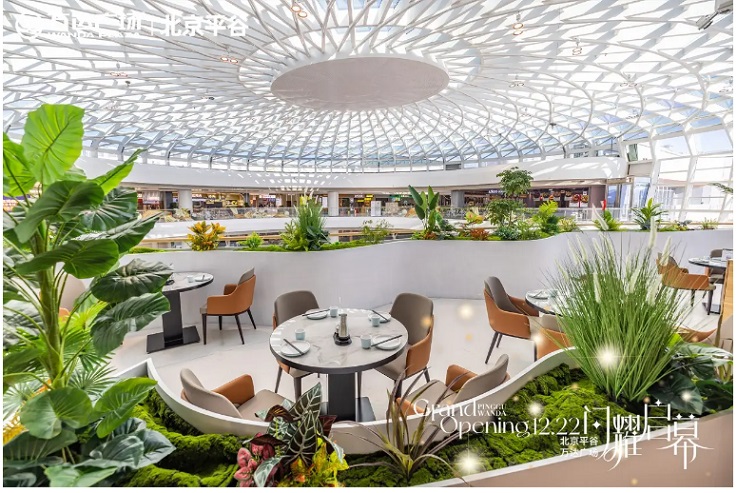 · 北京平谷萬(wàn)達(dá)廣場(chǎng),10000㎡生態(tài)公園與1800㎡穹頂天幕的組合,讓品牌打破標(biāo)準(zhǔn)化門店生長(zhǎng)出“郊野美學(xué)”新形態(tài),也讓消費(fèi)者擁有慵懶松弛的大尺度生態(tài)公園景觀;