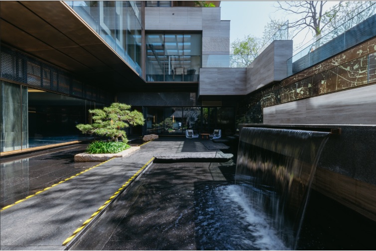 最令人驚艷的是下沉庭院,秉持“借水成景,自然共生”造園理念,打造中國(guó)黑奢石光面水幕墻,引廣富林水韻入境,層層遞進(jìn),渾然一體。馬賽克拼花泳池、無邊際玻璃幕墻、庭院鏡面水景,波光云影彼此映照,呈現(xiàn)出“三泖回瀾”的奢適意境。置身其中,仿佛能聽見“明月松間照,清泉石上流”的詩意吟唱,感受到那份超脫塵世的人文意境。