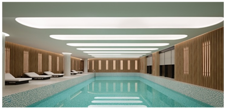 無界泳池:10X20米半標(biāo)四季恒溫泳池,下沉式庭院引入自然光景,馬賽克磚與木飾面營造度假氛圍,專業(yè)安全員全天守護。