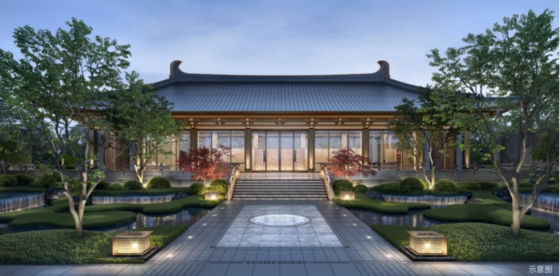 在景觀上,項目承接太液池“一池三山”造園手法,打造近5600㎡唐風園林,山水林瀑,飛鳥游魚和鎮(zhèn)宅之寶,還原盛唐園林的山水恢宏大境。設計府門-廳堂-庭園三進禮序,宮-苑-坊三重景觀體系,高闊府門,中廳承含元殿規(guī)制,屋面?zhèn)鞒泄沤ㄖ偶沟畹奈菁剐问,提取歇山頂建筑元素,單元入口取古代貴族門第“烏頭門”的形制,再現(xiàn)唐風府邸風華。
