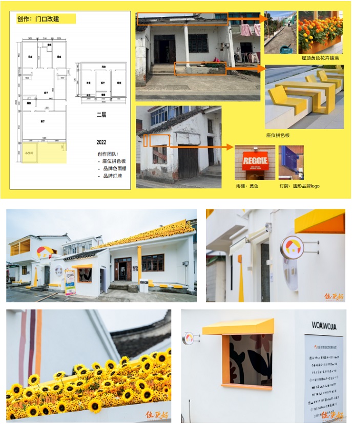 黃色的花卉和品牌燈牌讓整個(gè)院子大門充滿溫馨氣息