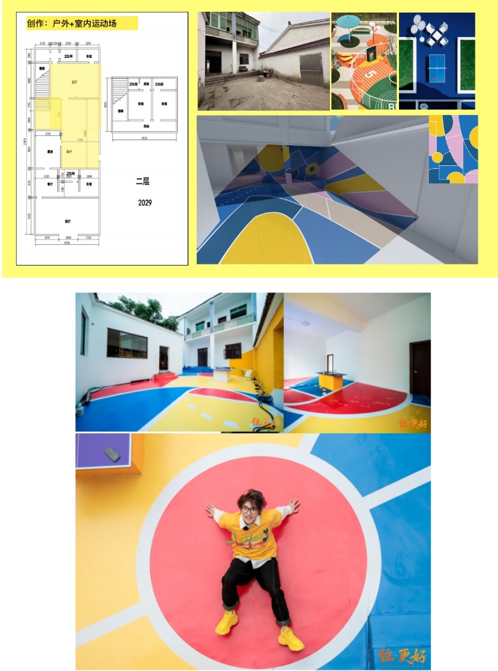 在他主導(dǎo)的《院子2022》改造項(xiàng)目中,對(duì)庭院、廚房、臥室等實(shí)用空間進(jìn)行刷白修繕的同時(shí),將藝術(shù)創(chuàng)作巧妙融入每一處場(chǎng)景,比如門口和小房間安置了光線座椅和屋頂黃色花卉光線裝置,還有品牌燈牌和主題雨棚,在前廳和廚房的墻面進(jìn)行主題繪畫創(chuàng)作。